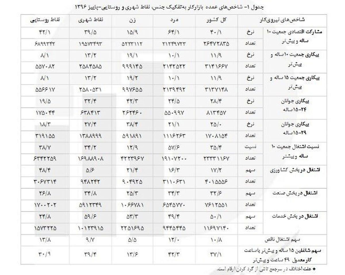 این نرخ بر اساس شاخص های عمده نیروی کار بر حسب جنس، نقاط شهری و روستایی در سال 95 از سوی مرکز آمار نشان می دهد از جمعیت 25 میلیون و 791 هزار و 450 نفر فعال کشور ،بالغ بر22 میلیون و588 هزار نفر شاغل و حدود 3 میلیون و 203 هزار و 398 نفر بیکار بوده اند. مقایسه این آمار حاکی از این است که حدود 743هزار شغل جدید در بازه زمانی 9 ماهه سال96 ایجاد شده است.