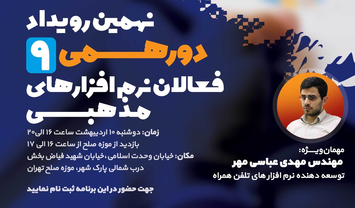 نهمین دورهمی فعالان نرمافزارهای مذهبی با حضور فعالان و توسعه دهندگان نرم افزارهای مذهبی دهم اردیبهشت در موزه صلح تهران برگزار میشود.