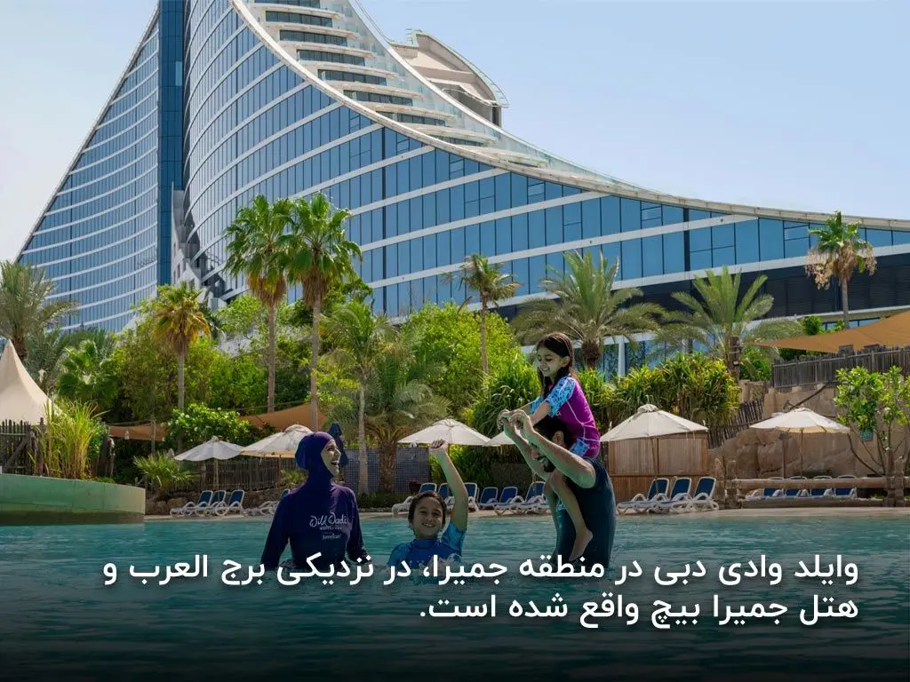 پارک آبی وایلد وادی دبی در منطقه جمیرا، در نزدیکی برج العرب و هتل جمیرا بیچ، واقع شده است. آدرس دقیق آن به شرح زیر است: