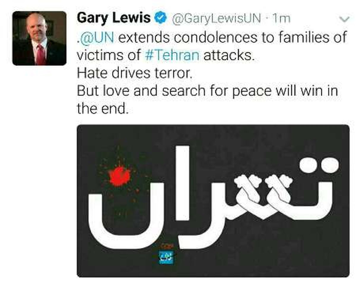 گری لوئیس نماینده سازمان ملل در تهران با بازماندگان حادثه تروریستی امروز -چهارشنبه- تهران ابراز همدردی کرد.