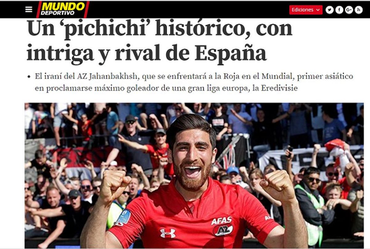 روزنامه موندو دپورتیوو اسپانیا گزارشی را درباره علیرضا جهانبخش، ستاره ایرانی آلکمار نوشت و به تمجید از علیرضا پرداخت که موفق شده بود رکوردی بی نظیر را به نام خود ثبت کند و به اولین آسیایی تبدیل شود که به عنوان آقای گلی یک لیگ معتبر اروپایی از آن خود کرده است.