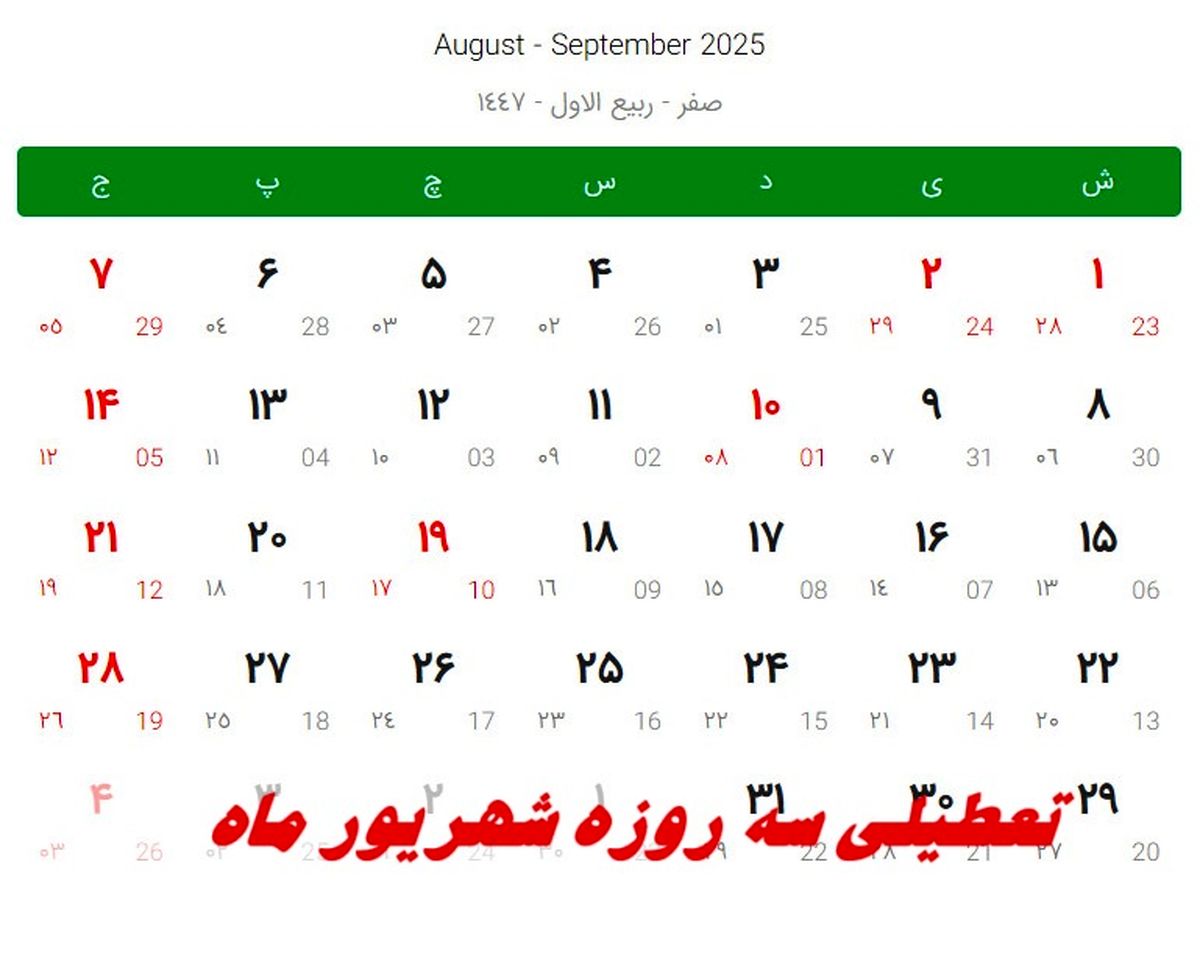 تمدید این روند باعث شده که در تقویم شهریور ۱۴۰۴ شاهد ۳ روز تعطیلی متوالی باشیم. این تعطیلی ۳ روزه در روزهای ۱۹، ۲۰ و ۲۱ شهریور اتفاق خواهد افتاد.